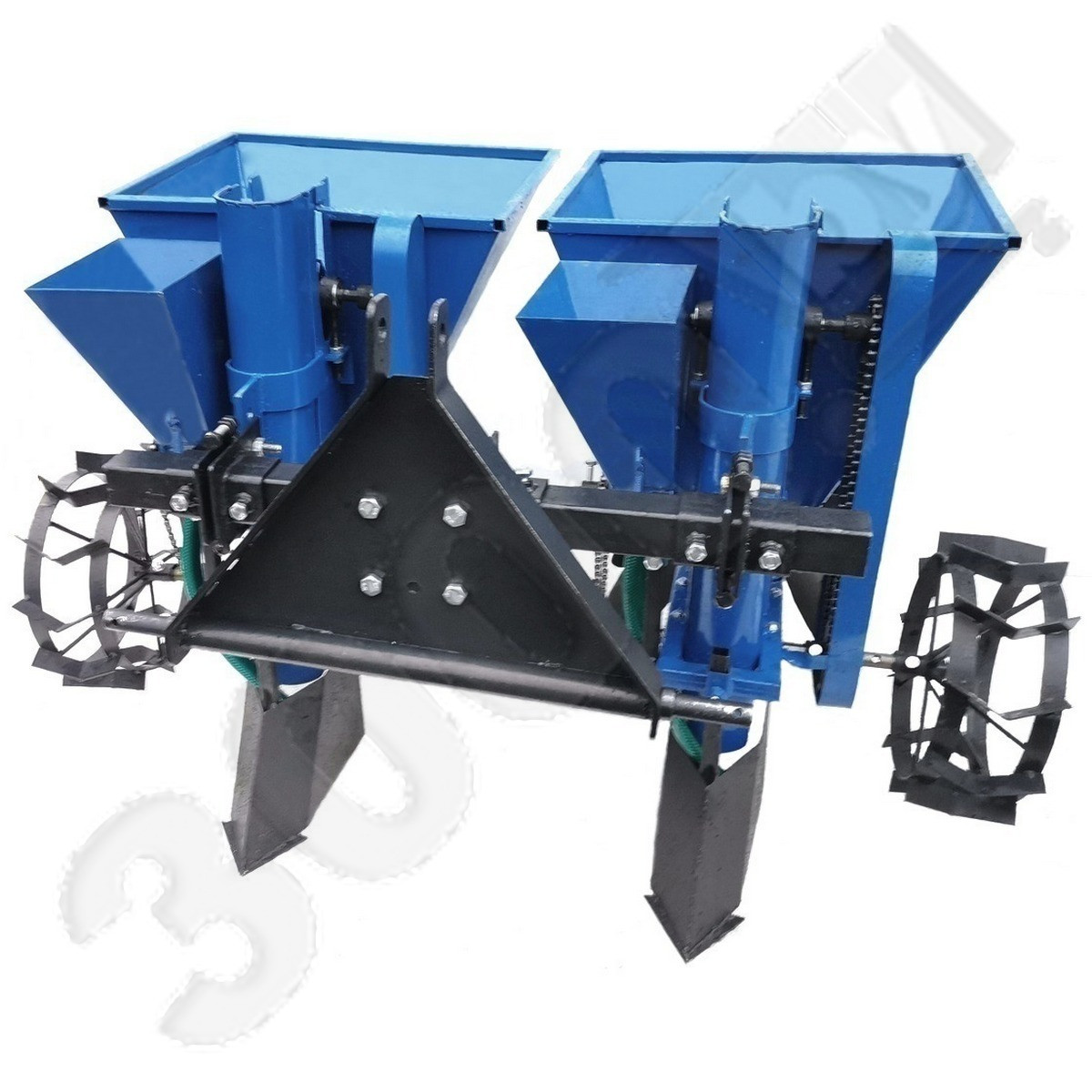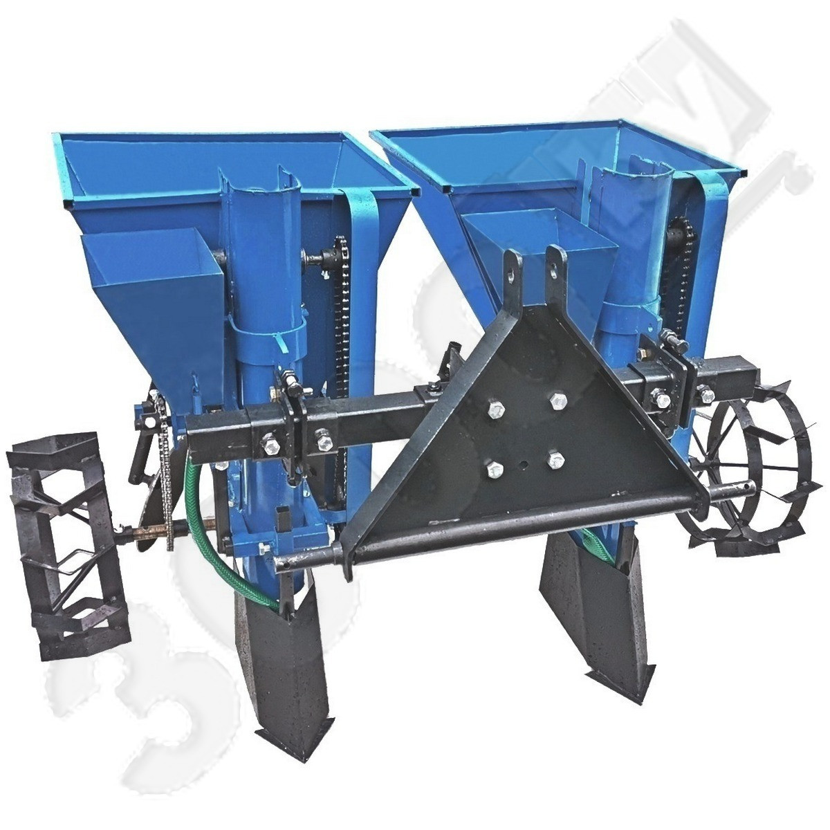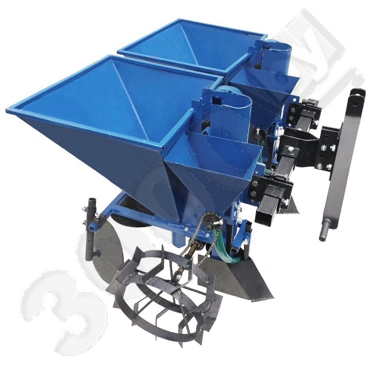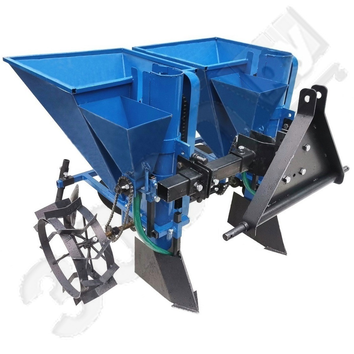 Картофелесажалка двухрядная к минитрактору с бункером для удобрений КС01-01 ТД предназначена для посадки картофеля на подготовленный грунт. Картофелесажалка совместно с минитрактором ускоряет процесс посадки картофеля. Два бункера по 34 литра и бункеры для внесения минеральных удобрений по 4 литра, позволят Вам быстро и качественно провести посадку картофеля на большой площади.